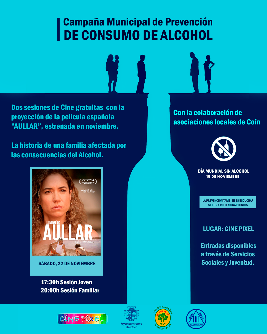 El Ayuntamiento de Coín apuesta por la prevención ante el consumo de alcohol con motivo del Día Mundial sin Alcohol que tiene lugar el 15 de noviembre con la proyección de ‘Aullar’, que incluirá una charla con protagonistas de la película. Se trata de una campaña que ha sido presentada hoy en el municipio por parte de la concejala de Servicios Sociales y Participación Ciudadana, Belén González, junto al actor Antonio Jesús Serrano, así como representantes de la Asociación de Alcohólicos Anónimos Grupo Amanecer y la Asociación de Alcohólicos Rehabilitados (ARCO) y de los Cines Píxel de Coín.