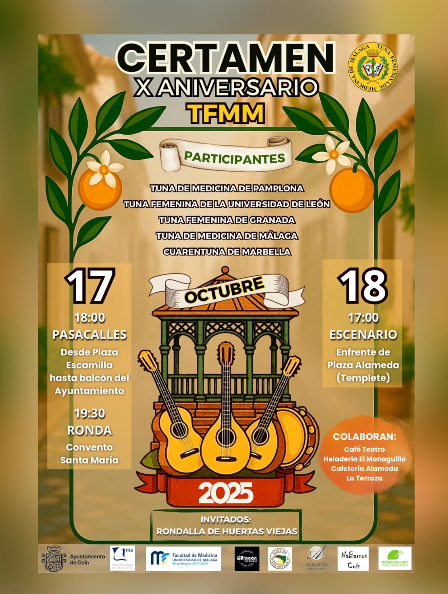 Celebra el décimo aniversario del ritmo de las tunas en Coín el próximo 17 y 18 de octubre con un pasacalles, y pases en el entorno del Convento Santa Maria, Plaza Escamilla, y Plaza Alameda.
