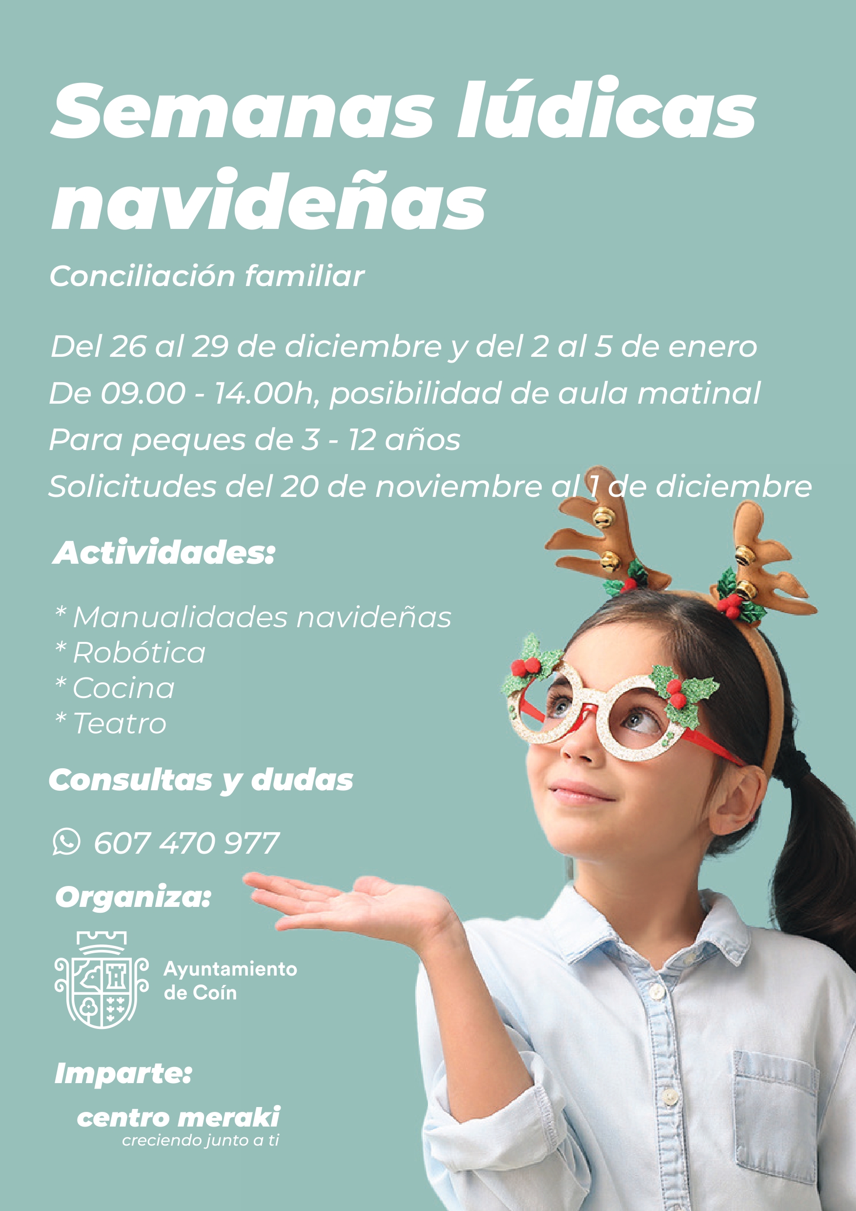 Del 26 al 29 de diciembre y del 2 al 5 de enero el ayuntamiento de Coín ha organizado unas actividades lúdicas que impartirá el Centro Meraki para niños y niñas de 3 a 12 años