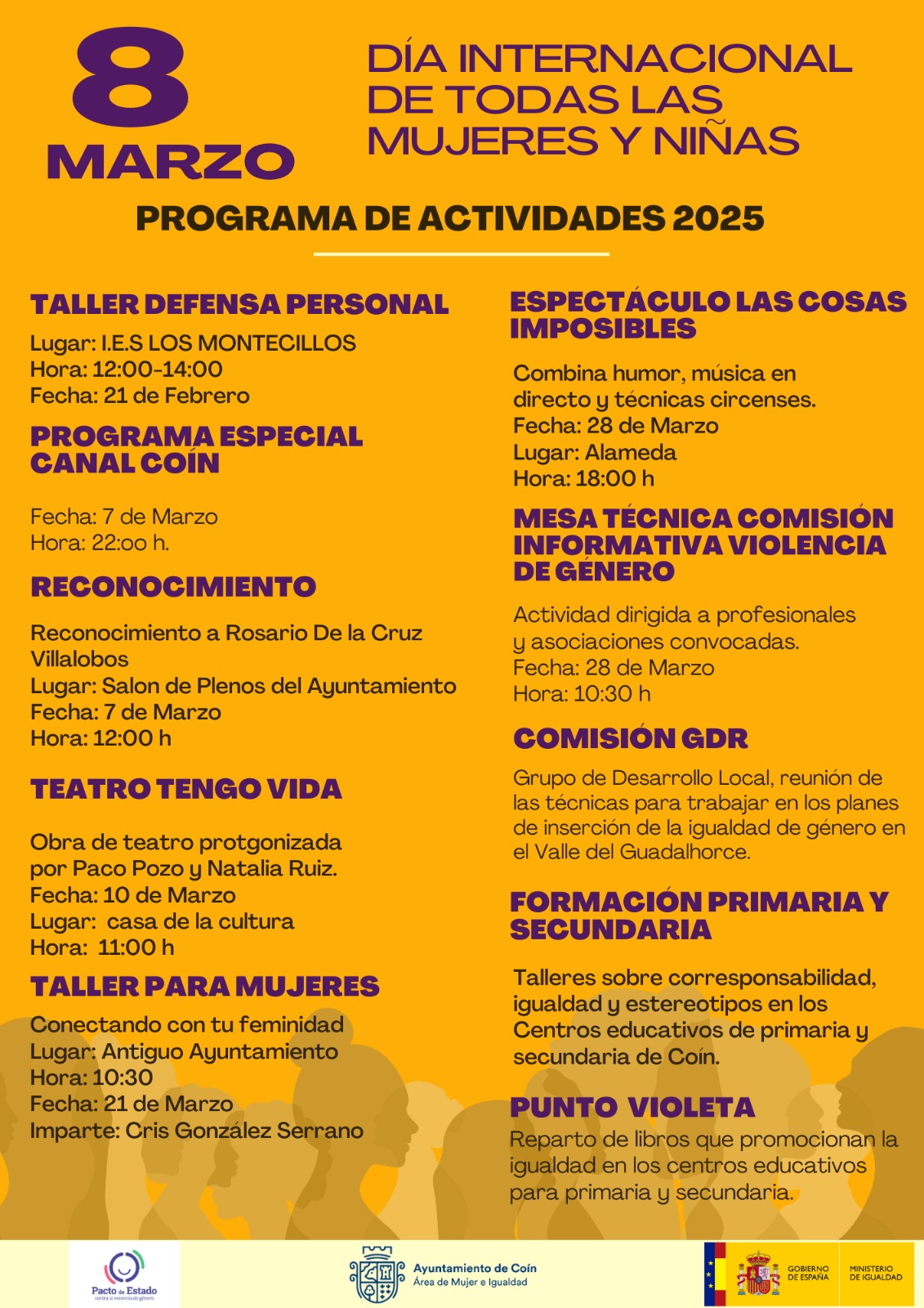 El Ayuntamiento de Coín ha presentado a través del área de Mujer e Igualdad un calendario de talleres, actividades y formaciones para celebrar el Día Internacional de todas las Mujeres y las Niñas, donde también se reconocerá a Rosario de la Cruz, la primera mujer en crear una asesoría en Coín. Las actividades están dirigidas tanto para jóvenes como para ciudadanía en general.