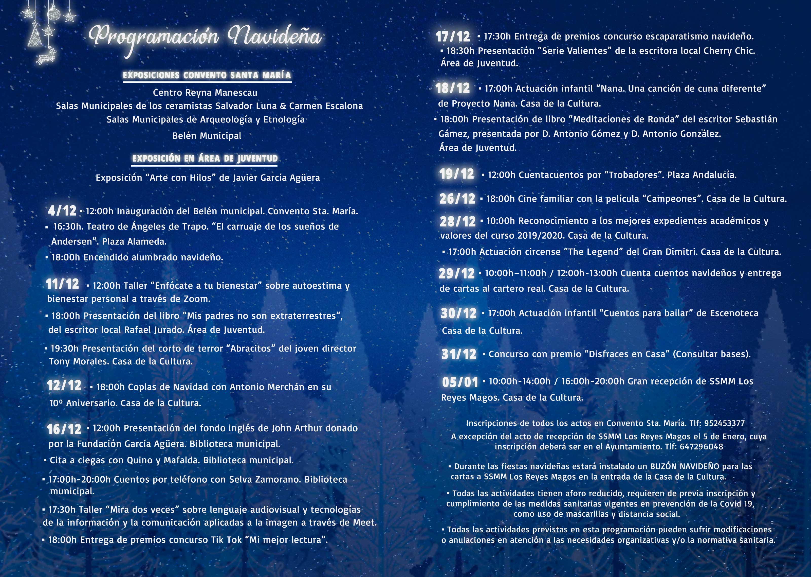 Para este año, eventos tan tradicionales como la gran fiesta de disfraces de Nochevieja, la Cabalgata de Reyes Magos o el poblado y cabalgata de Papá Noel no se podrán realizar, así como tampoco el mercadillo solidario. No obstante, desde el Ayuntamiento se han programado distintos eventos y actividades para mantener dichas tradiciones de manera segura. Los Reyes Magos de Oriente estarán en la Casa de la Cultura el día 5 de enero de 10h a 14h y de 16h a 20h, para lo que será necesario inscripción previa en los teléfonos indicados en el cartel y programa navideño. “Debemos mantener la ilusión de los niños y niñas y la nuestra propia por lo que haremos todo lo posible para que Sus Majestades Los Reyes Magos de Oriente vengan a Coín a recibir a nuestros pequeños”, ha destacado Santos.