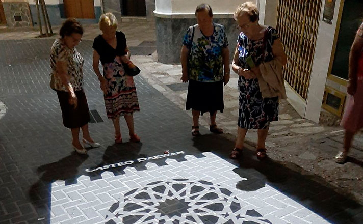 Por ello, para visibilizar el trazado de la antigua muralla árabe se han incluido mosaicos en el suelo que toda persona se irá encontrando a su paso por el centro. Además, en las casas incorporadas en la antigua muralla y donde en muchos casos se han localizado restos de arcos y otras estructuras se han instalado unos azulejos o paneles informativos. Los visitantes también se encontrarán con proyecciones en el suelo con motivos árabes. Hay hasta cuatro instalados y nos comunican que hace muchos años esa era una de las entradas a la villa.