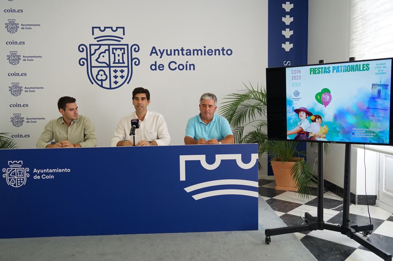 Agosto se acerca y con él una de las fiestas más singulares y especiales de Coín. Llegan las Fiestas Patronales que este año tendrá lugar del 10 al 15 de agosto. Así lo han anunciado esta mañana el alcalde de la localidad, Francisco Santos, junto al concejal de Festejos, Juan Antonio Bernal, y el concejal de Agricultura, Antonio González, donde han desgranado una programación cuya principal novedad es la ampliación tanto de horario como de contenido. "Tras varios meses en los que se lleva trabajando en una nueva programación de nuestra feria de agosto este año la jornada comenzará antes, por la tarde a partir de las 19:00h y con varias barras de comida y bebida que se instalarán en la plaza Alameda”, ha destacado el regidor coineño.