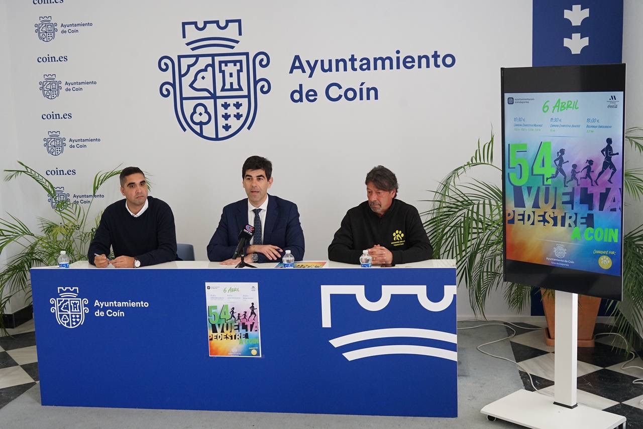 La solidaridad y el deporte vuelven a darse la mano en Coín una vez más con la Vuelta Pedestre. La sala de prensa del Ayuntamiento ha acogido esta mañana la presentación oficial de esta carrera que es la más longeva y con mayor trayectoria en el municipio. Han asistido el alcalde, Francisco Santos, el concejal de Deportes, Jorge González, así como el presidente de la asociación beneficiaria, Huellas Terapéuticas, Antonio Solano y los técnicos municipales. “Otro año más volvemos a celebrar el día del deporte por excelencia en Coín con nuestra Vuelta Pedestre donde la ciudadanía sale a la calle a correr y demostrar su solidaridad y apoyar a la causa”, ha iniciado el alcalde en su intervención.