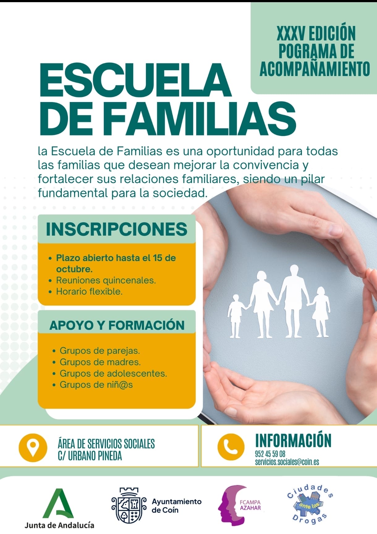 El Área de Servicios Sociales del Ayuntamiento de Coín continúa apostando por su oferta formativa para la prevención social. Esta semana, el alcalde de la localidad, Francisco Santos, y la concejala responsable del área, Belén González, han presentado las diferentes actividades que se presentan este curso. “Comenzamos con la apertura de inscripción de uno de los programas más longevos de esta área como es la Escuela de Familias, pero contaremos con muchas novedades como es la ponencia de Pedro García Aguado, con amplia experiencia en las relaciones intrafamiliares”, ha explicado el regidor coineño.