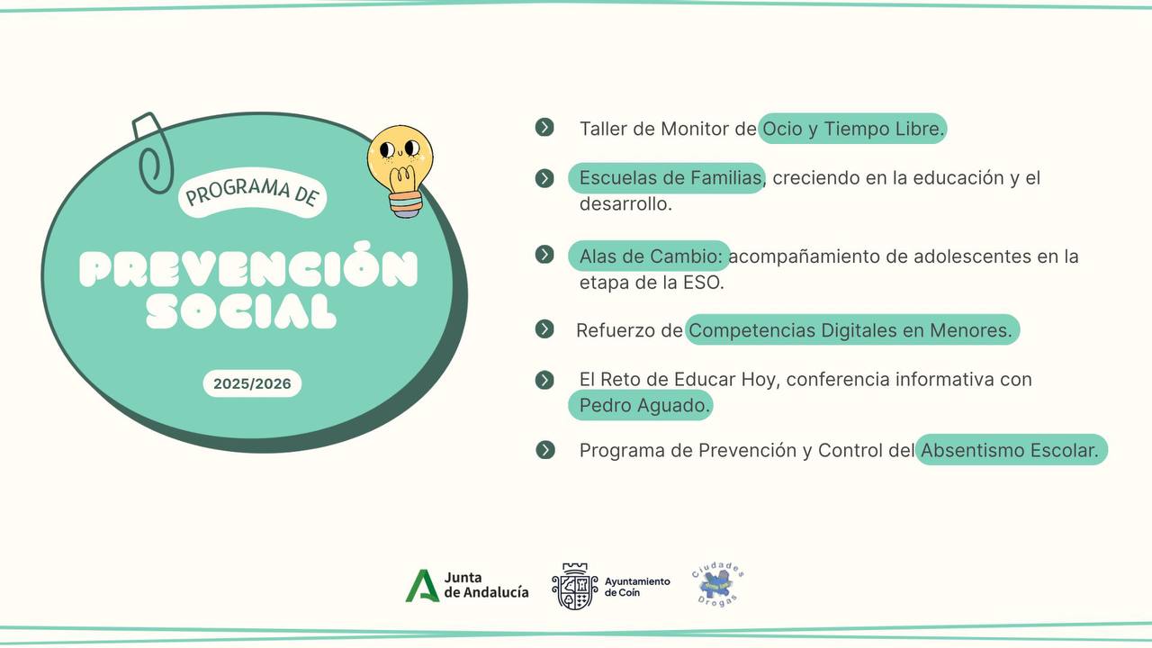 El programa de prevención social del Ayuntamiento de Coín se trata de una apuesta el acompañamiento, la formación y la prevención como pilares fundamentales para construir una sociedad más sana, más fuerte y con más oportunidades. Belén González ha destacado la puesta en marcha del Taller de Monitor de Ocio y Tiempo Libre, que se encuentra enmarcado en el programa Ciudades ante la Droga de la Junta de Andalucía y que ya ha abierto su periodo de inscripciones para todas aquellas personas interesadas. “El único requisito que se solicita es el de contar con Graduado Escolar. Se dirige este curso, especialmente, a los jóvenes de entre 16 y 30 años, pero está abierto a toda la ciudadanía”, ha destacado. El curso se compone de 310 horas divididas en 150 horas de teoría y 160 horas de prácticas.