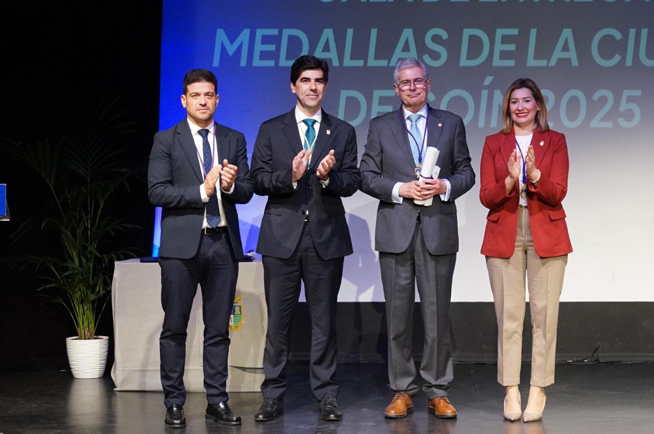 Los vecinos de Coín D. Miguel Fernández Tapia-Ruano, D. Francisco Marmolejo Cantos y el Club de Ajedrez Coín han sido reconocidos con la Medalla de la Ciudad de Coín 2025. El acto de entrega de esta distinción, que es la más honorífica que puede conceder el Ayuntamiento, ha tenido lugar este viernes 17 de enero en la Casa de la Cultura de la ciudad. “Sois un ejemplo y un orgullo para todos los vecinos de Coín. Enhorabuena a todos por vuestra gran labor que ha contribuido enormemente al desarrollo, patrimonio e imagen de nuestra ciudad”, ha destacado el alcalde Francisco Santos.