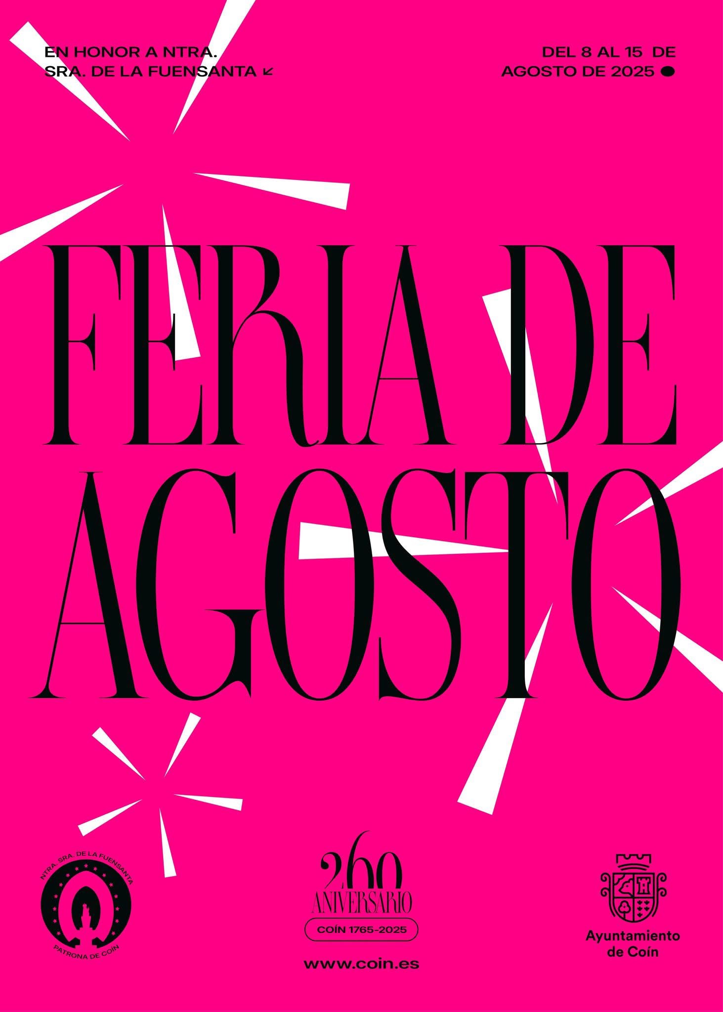 Más de 15 artistas en directo, reconocidos a nivel nacional, y djs de Coín y de la provincia componen la Feria de Agosto de Coín en honor a la Patrona, la Virgen de la Fuensanta que cumple su 260º aniversario. Con esta programación se da cabida a todas las edades, así como a una gran variedad de gustos musicales.