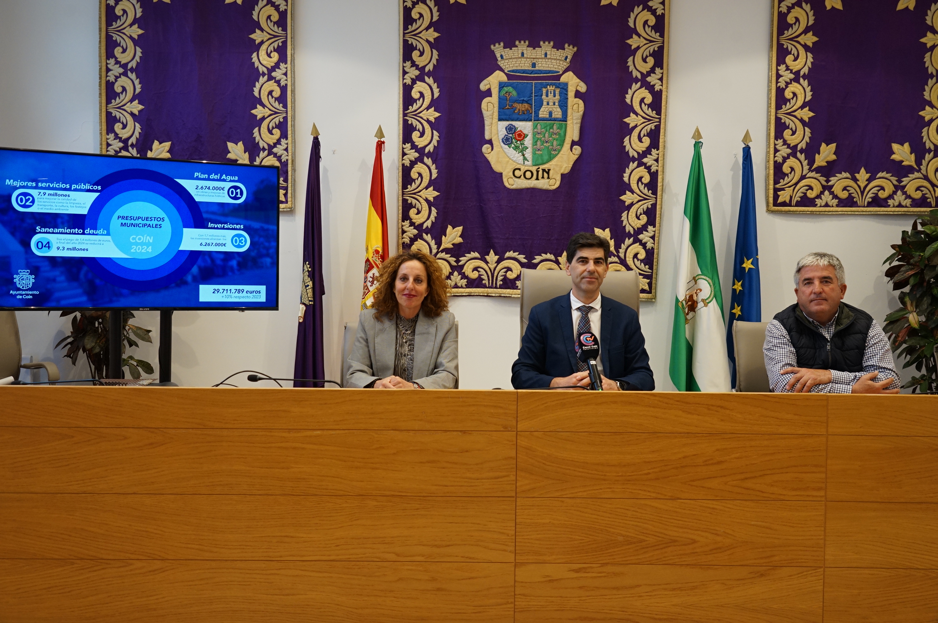 El Ayuntamiento de Coín incrementa sus presupuestos un 10%, ascendiendo a los 29 millones de euros para el próximo 2024. El alcalde de Coín, Francisco Santos, ha presentado hoy el proyecto de estos Presupuestos Municipales de Coín para el próximo año donde ha destacado la “gran capacidad inversora” de la administración local, teniendo en cuenta el trabajo de saneamiento de las cuentas públicas llevado a cabo a lo largo de estos años. “Son unos presupuestos ilusionantes, donde vuelve a ser protagonista la inversión en nuevos proyectos, la mejora de la calidad de nuestros servicios públicos y gestionando los recursos económicos de forma eficiente, responsable y comprometida”, ha asegurado el regidor coineño, quien ha estado acompañado por el primer teniente de alcalde, Antonio González, y la tercera teniente de alcalde, Raquel López.
