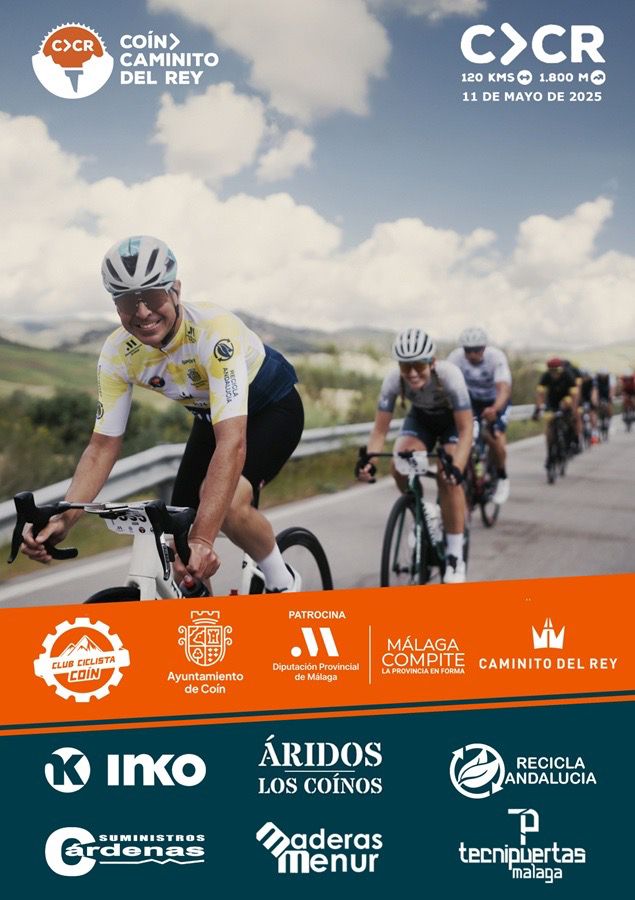 Este domingo 1.000 ciclistas disputarán la IV Cicloturista Coín-Caminito del Rey, una competición que en su cuarta edición se ha convertido en todo un referente del ciclismo provincial. Organizada por el Ayuntamiento de Coín y el Club Ciclista Coín con el impulso de la Diputación de Málaga, la prueba volverá a contar con un itinerario circular de 120 kilómetros con salida y meta en Coín pasando por otros 10 municipios del Valle del Guadalhorce, el entorno del Caminito del Rey y la Sierra de las Nieves. Será este domingo, 11 de mayo, con salida prevista a las 9:00h desde el Parque Periurbano de la capital del Valle del Guadalhorce.