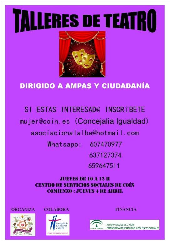 La Concejalía de Igualdad colabora con el Proyecto Espacio Sórico, para la realización de talleres de teatro por la igualdad. Inscripciones Área de Igualdad, o bien por whatsapp en los teléfonos indicados.